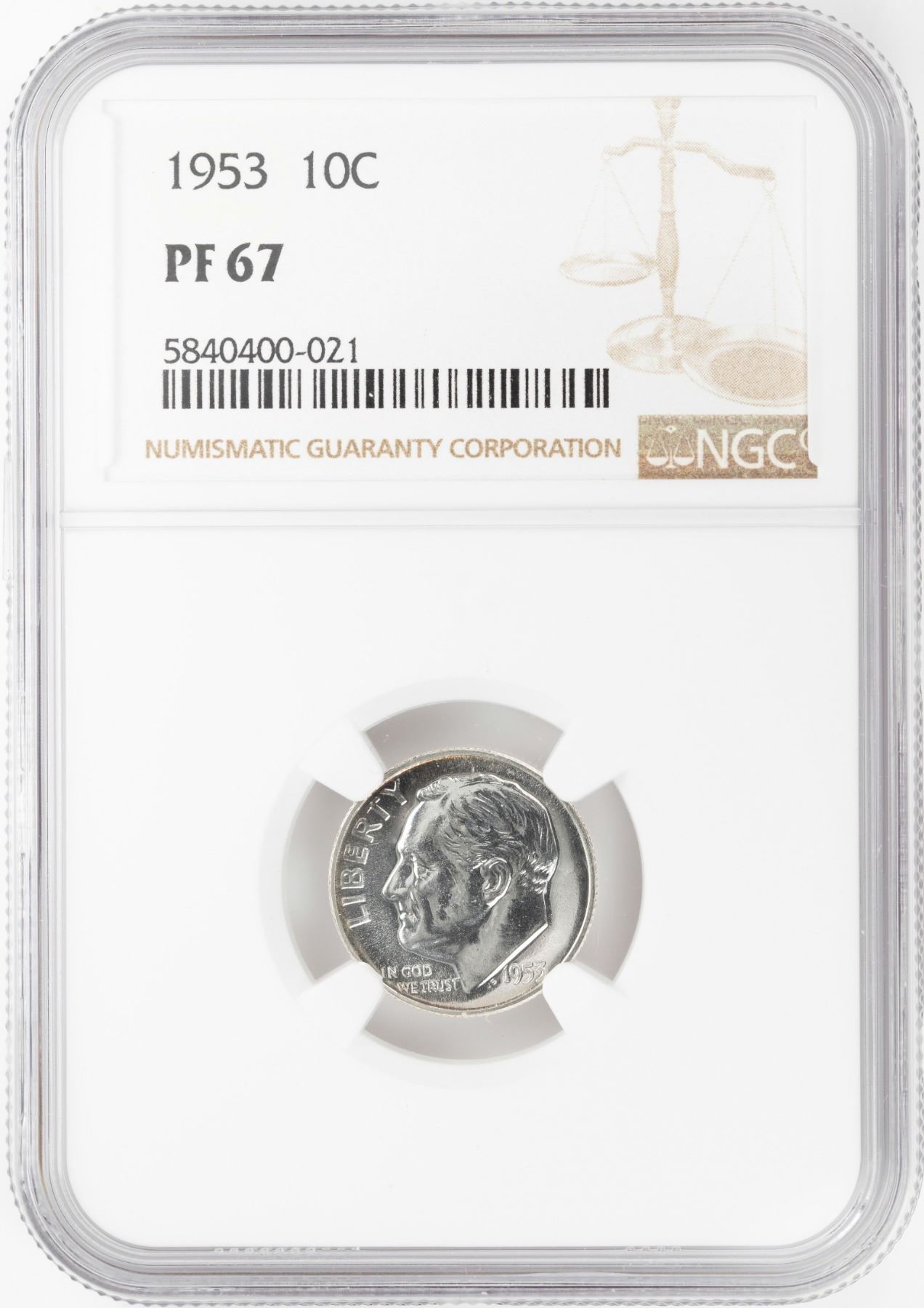 One 1953 Proof Roosevelt Dime Coin NGC PF67.