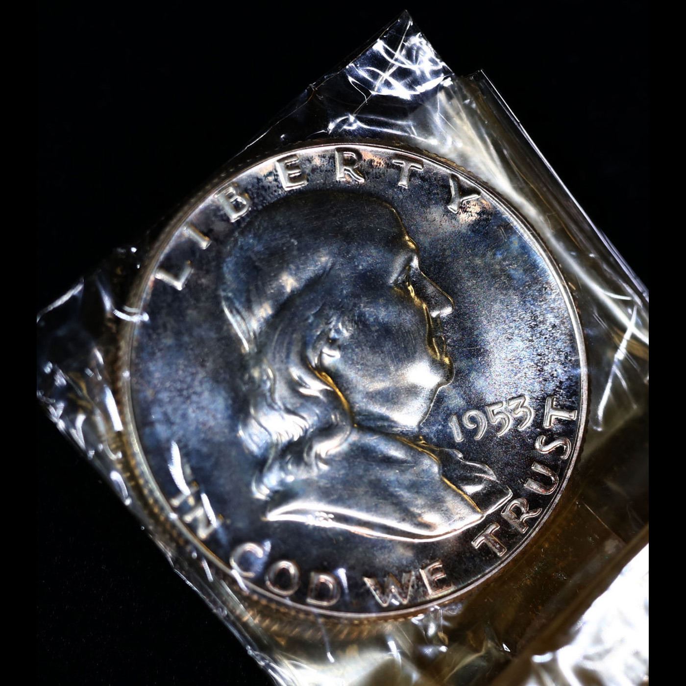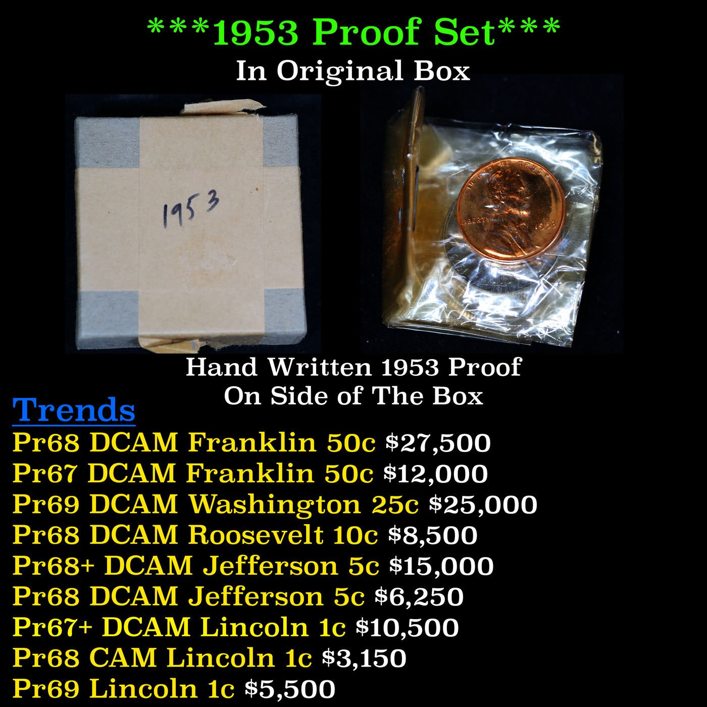 1953 Proof Set In Original Box. This proof set is in the original mint packaging with the original box. This set contains a proof Silver Franklin half Trends pr68 DCAM $77,500, pr67 DCAM $11,000 pr68 CAM $4,400, pr69 $15,500, pr65 DCAM $1,580, a Proof Silver Washington quarter pr69 $900, pr69 cam $1,450, pr69 DCAM $17,500 pr68 DCAM $4,900, the proof Silver Roosevelt dime pr69 $575, pr69 CAM $2,750 pr68 DCAM $17,500 + the proof nickel pr69 $600, pr69 CAM $1,500, pr68 DCAM $7,750, and the proof penny pr69 $,2,750, pr68 CAM $3,750 PR68 DCAM $8,500. All coins in the original packaging