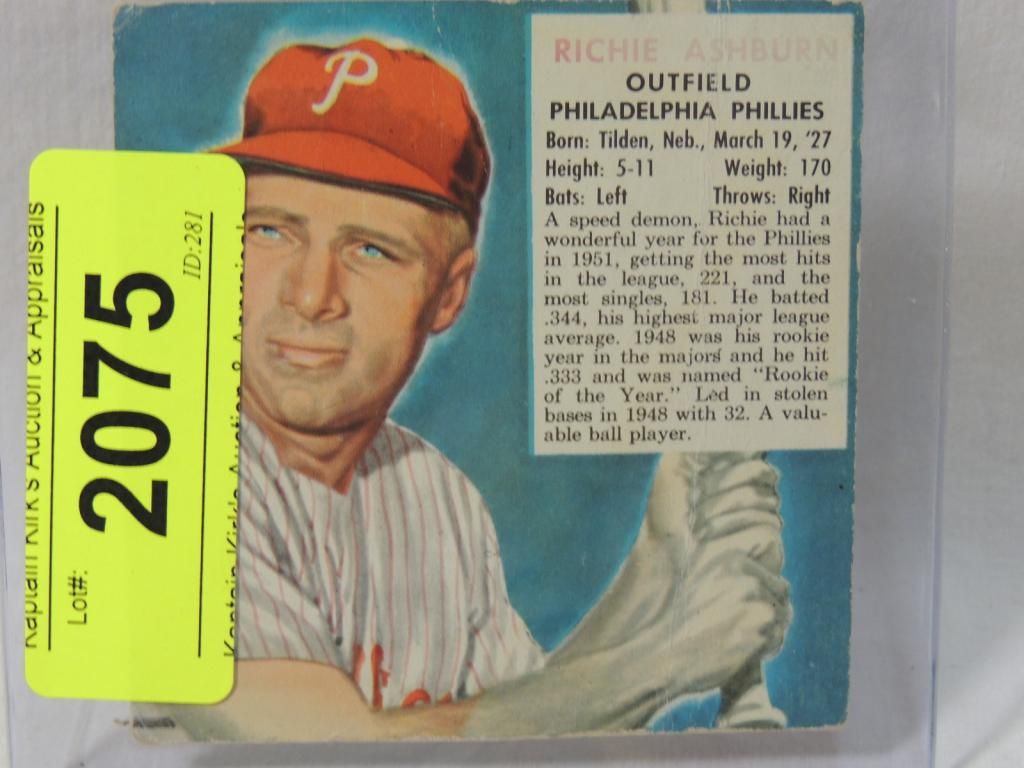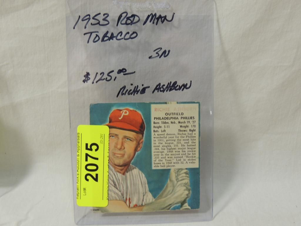 1953 RED MAN TOBACCO RICHIE ASHBURN BASEBALL CARD. BASEBALL COLLECTIBLE. VINTAGE CARD. GOOD CONDITION. IN PLASTIC SLEEVE. AS SHOWN. SEE PHOTO FOR MORE DETAILS.