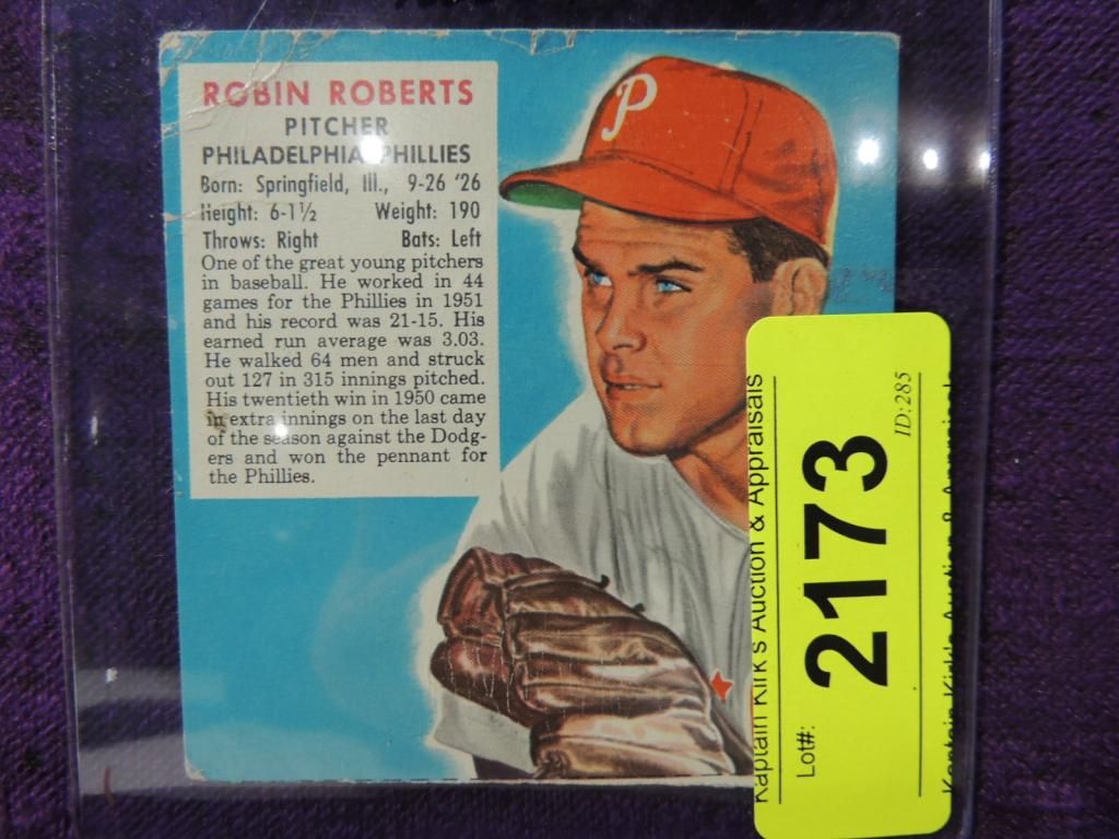 1953 RED MAN TOBACCO ROBIN ROBERTS BASEBALL CARD. BASEBALL COLLECTIBLE. VINTAGE CARD. GOOD CONDITION. IN PLASTIC SLEEVE. AS SHOWN. SEE PHOTO FOR MORE DETAILS.
