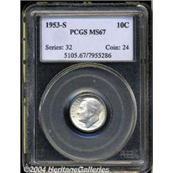 <B>1953-S<10C> MS67 PCGS.</B></I> Nicely struck, with grainy surfaces that emit a soft luster beneath a light silver-gray color. <BR><BR><B>Important notice:</B> Heritage usually auctions material at the rate of 200-250 lots per hour. On some occasions eBay Live bid software or the Internet may not be able to keep up with the pace of the auction. We recommend placing a realistic absentee bid now as insurance to avoid disappointment. Occasionally the auctioneer may eliminate or reject an eBay Live bid, and the auctioneer may also reopen a lot after the close of the eBay live bidding (usually because we missed an audience bid), and may reject your bid even if it shows you as the winning bidder. By bidding via eBay Live, you agree that Heritage may award the lot to another bidder at its sole discretion under the circumstances described above or any other reasonable circumstances. Since eBay bids are not shown to us until we open the lot on the floor, we treat those bids just like floor bids. In most cases the floor responds before the eBay bid is presented to us, due to Internet lag time, so for consistency we have made it a policy that floor bids are always considered first over tie eBay live bids. Also please note that all Heritage lots purchased through eBay Live carry a 20% Buyer's Premium. Please make sure you read the Terms and Conditions before you bid. </span></font></tr></table></td></tr></table>