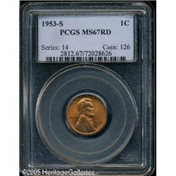 <B>1953-S 1C MS67 Red PCGS.</B></I> Sharply struck, with lustrous orange-gold surfaces. There are no mentionable contact marks, but a few areas of light discoloration are noted on the lower reverse. Population: 80 in 67, 0 finer (1/05). Lot:5562