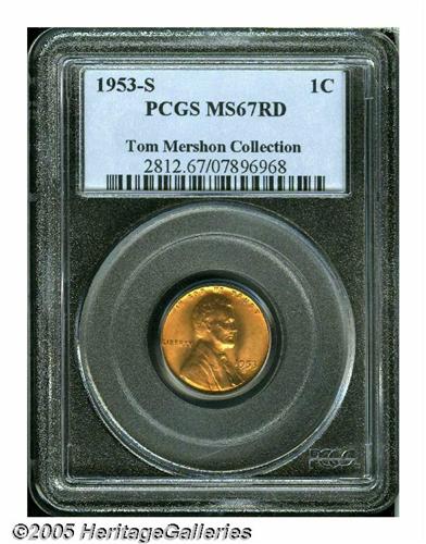 <B>1953-S<1C> MS67 Red PCGS.</B></I> Undeniably original, the orange-red surfaces are aglow with undisturbed mint frost.<BR><I>From The Tom Mershon #2 All-Time PCGS Registry Set of Lincoln Wheat Cents.</B></I>