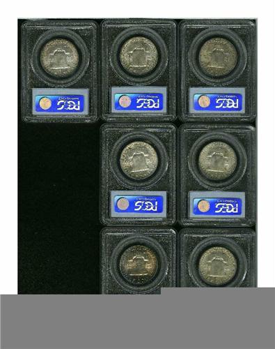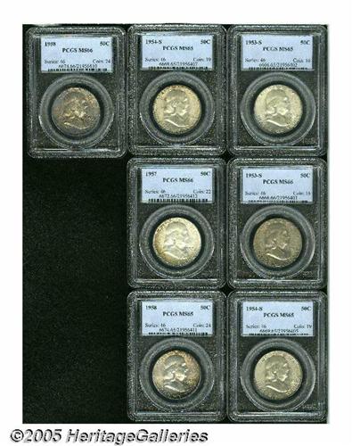 <B>1953-S<50C> MS65 PCGS,</B></I> pearl-gray and dusky chestnut colors; <B>1953-S MS66 PCGS,</B></I> variegated sea-green and lilac toning, beautifully preserved; <B>1954-S MS65 PCGS,</B></I> battleship-gray and tan patination; <B>1954-S MS65 PCGS,</B></I> well preserved, dappled stone-gray and golden-brown colors; <B>1957 MS66 PCGS,</B></I> russet and olive toning deepens at the borders; <B>1958 MS65 PCGS,</B></I> Type One Reverse, beautiful plum, navy-blue, and golden-brown patina; and a <B>1958 MS66 PCGS,</B></I> Type One Reverse, deep mauve, olive, and gray obverse toning, a possible fingerprint on the neck.