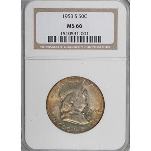 <B>1953-S 50C MS66 NGC.</B></I> NGC Census: (385/5). PCGS Population (303/1). Mintage: 4,148,000. Numismedia Wsl. Price for NGC/PCGS coin in MS66: $180. (#6666)<BR><BR><B>Coin Engraver:</B> John R. Sinnock<BR><BR><b>Shipping:</b> Coins & Currency (<a target="_blank" href="http://www.heritageauctions.com/common/shipping.php">view shipping information</a>)