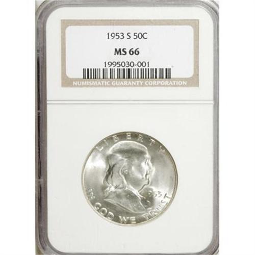 <B>1953-S 50C MS66 NGC.</B></I> NGC Census: (390/5). PCGS Population (310/1). Mintage: 4,148,000. Numismedia Wsl. Price for NGC/PCGS coin in MS66: $180. (#6666)<BR><BR><B>Coin Engraver:</B> John R. Sinnock<BR><BR><b>Shipping:</b> Coins & Currency (<a target="_blank" href="http://www.heritageauctions.com/common/shipping.php">view shipping information</a>)