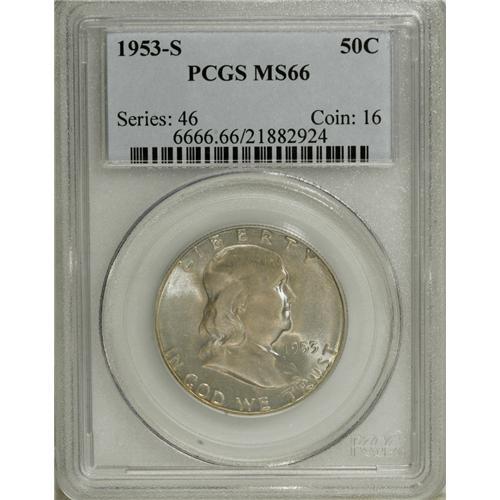 1953-S 50C MS66 PCGS. Lustrous surfaces are covered wi