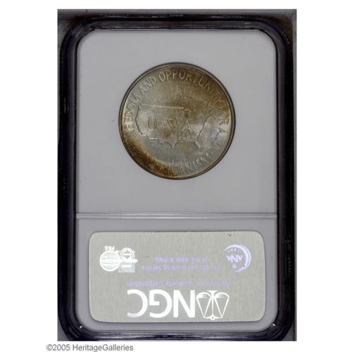 <B>1953-S<50C> Washington-Carver MS67 NGC.</B></I> Orange-red, forest-green, powder-blue, and pearl-gray colors endow this splendidly patinated Superb Gem. Dazzling luster demonstrates a pronounced cartwheel effect. George Washington Carver's cheekbone and the state of Texas are not fully struck, as always for the issue, but only a few trivial grazes on the reverse field limit the lofty grade. Population: 5 in 67, none finer (9/05).