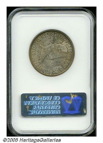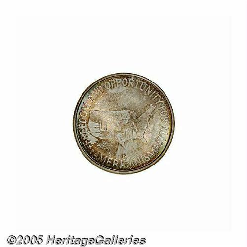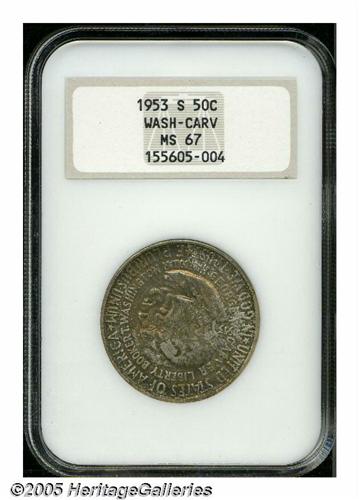 <B>1953-S<50C> Washington-Carver MS67 NGC.</B></I> Vibrantly toned with russet-red and gold predominating with rainbow peripheral as well. Fully struck and carefully preserved since the time of issue, likely in the original paper holder in which these were issued. As nice as this date is ever found, especially so if you appreciate boldly toned coins. The combined NGC and PCGS Population reports show seven coins graded this high with none seen finer.