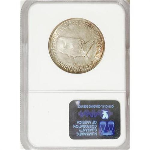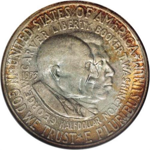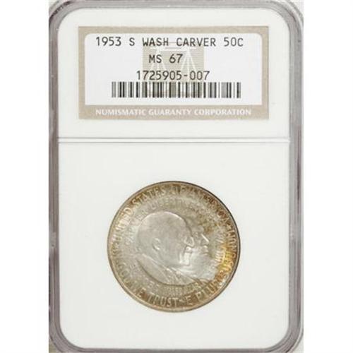 <B>1953-S 50C Washington-Carver MS67 NGC.</B></I> Gilroy Roberts was the engraver responsible for making this Isaac Scott Hathaway design coinage-ready, and while the design is not a favorite of most numismatic aesthetes, credit must be given to Roberts for his efforts. The Superb Gem offered here is more than presentable, with potent luster that shines beneath silver-gray patina in the centers and bronze-tan toning at the rims. Census: 5 in 67, 3 in 67 <B><img src="/images/star.gif" width="10" height="10" alt="" border="0"></B></I>, 0 finer (11/07).<BR><BR><b>Shipping:</b> Coins & Currency (<a target="_blank" href="http://www.heritageauctions.com/common/shipping.php">view shipping information</a>)
