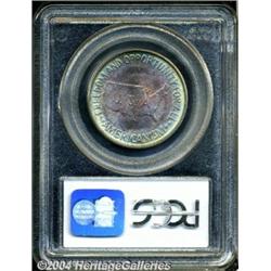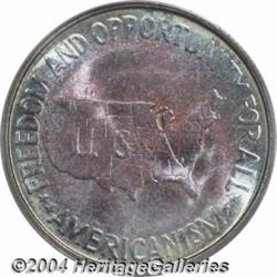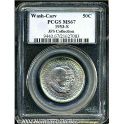 <B>1953-S<50C> Washington-Carver MS67 PCGS.</B></I> Absolutely gorgeous turquoise-blue and crimson-red color overlays each side of this well made Gem, which also exhibits hints of orange patina, near the center of the reverse. A few minor contact marks are seen on G.W. Carver's portrait, and on the map on the reverse. Some "as made" elements of the coin include a few wispy die polish lines, on each side, and some chatter on Carver's cheek, the result of striking incompleteness. Conditionally rare at the MS67 grade level. Population at both services, combined: 6 in 67, 0 finer (6/04).<BR><I>From the JFS Collection, the #1 All-Time PCGS Registry Set.</B></I> <BR><BR><B>Important notice:</B> Heritage usually auctions material at the rate of 200-250 lots per hour. On some occasions eBay Live bid software or the Internet may not be able to keep up with the pace of the auction. We recommend placing a realistic absentee bid now as insurance to avoid disappointment. Occasionally the auctioneer may eliminate or reject an eBay Live bid, and the auctioneer may also reopen a lot after the close of the eBay live bidding (usually because we missed an audience bid), and may reject your bid even if it shows you as the winning bidder. By bidding via eBay Live, you agree that Heritage may award the lot to another bidder at its sole discretion under the circumstances described above or any other reasonable circumstances. Since eBay bids are not shown to us until we open the lot on the floor, we treat those bids just like floor bids. In most cases the floor responds before the eBay bid is presented to us, due to Internet lag time, so for consistency we have made it a policy that floor bids are always considered first over tie eBay live bids. Also please note that all Heritage lots purchased through eBay Live carry a 20% Buyer's Premium. Please make sure you read the Terms and Conditions before you bid. </span></font></tr></table></td></tr></table>