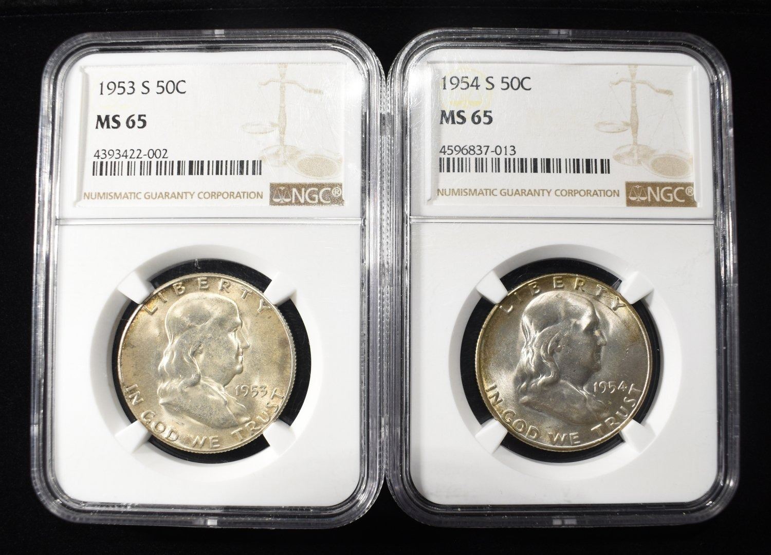 1953-S, 54-S FRANKLIN HALF DOLLAR NGC MS65
