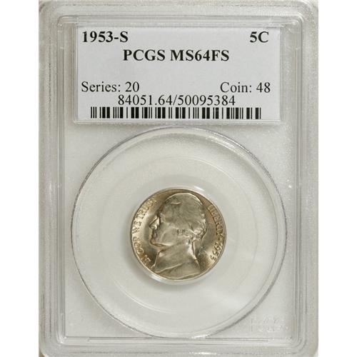 <B>1953-S 5C MS64 Full Steps PCGS.</B></I> An extreme rarity with Full Steps, this example is lustrous and virtually untoned. Typical mushiness exists on most of the reverse details but the steps of Monticello are nicely defined. Two or three tiny marks are noted on each side. Population: 14 in 64 Full Steps, 2 finer (3/07).<BR><BR><b>Shipping:</b> Coins & Currency (<a target="_blank" href="http://www.heritageauctions.com/common/shipping.php">view shipping information</a>)