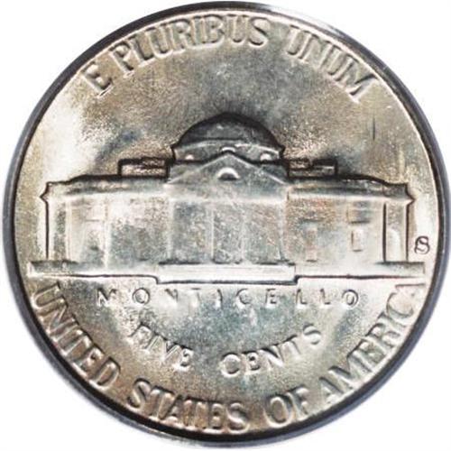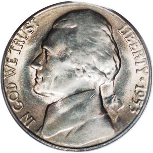 <B>1953-S 5C MS64 Full Steps PCGS.</B></I> An extreme rarity with Full Steps, this example is lustrous and virtually untoned. Typical mushiness exists on most of the reverse details but the steps of Monticello are nicely defined. Two or three tiny marks are noted on each side. Population: 14 in 64 Full Steps, 2 finer (5/07).<BR><BR><b>Shipping:</b> Coins & Currency (<a target="_blank" href="http://www.heritageauctions.com/common/shipping.php">view shipping information</a>)