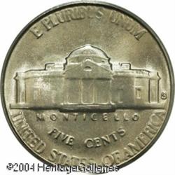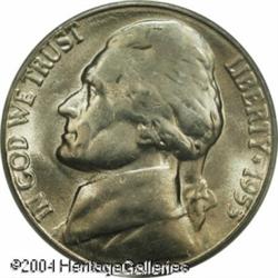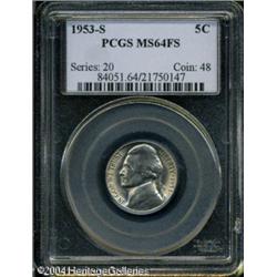 1953-S 5C MS64 Full Steps PCGS. Since we began kee <B>1953-S 5C MS64 Full Steps PCGS.</B></I> Since we began keeping records, this is one of only four 1953-S Nickels we have had the pleasure to offer with the coveted "Full Steps" designation. According to Bernard Nagengast, the appearance frequency of the five step variety is only 1 in 5,000; six steps are unverified. We suspect this ratio might be slightly conservative. A fully brilliant specimen, only a few inconsequential contact marks are seen that limit the grade. Definitely a "must-see" coin for the Jefferson Nickel specialist. Population: 13 in 64, 1 finer (10/04). <BR><BR><B>Important notice:</B> Heritage usually auctions material at the rate of 200-250 lots per hour. On some occasions eBay Live bid software or the Internet may not be able to keep up with the pace of the auction. We recommend placing a realistic absentee bid now as insurance to avoid disappointment. Occasionally the auctioneer may eliminate or reject an eBay Live bid, and the auctioneer may also reopen a lot after the close of the eBay live bidding (usually because we missed an audience bid), and may reject your bid even if it shows you as the winning bidder. By bidding via eBay Live, you agree that Heritage may award the lot to another bidder at its sole discretion under the circumstances described above or any other reasonable circumstances. Since eBay bids are not shown to us until we open the lot on the floor, we treat those bids just like floor bids. In most cases the floor responds before the eBay bid is presented to us, due to Internet lag time, so for consistency we have made it a policy that floor bids are always considered first over tie eBay live bids. Also please note that all Heritage lots purchased through eBay Live carry a 20% Buyer's Premium. Please make sure you read the Terms and Conditions before you bid. This lot is being auctioned in conjunction with a live floor auction by Heritage Galleries & Auctioneers. All final auction and invoice information will be supplied by Heritage Galleries & Auctioneers, and all other information should be considered preliminary. Lot:5642