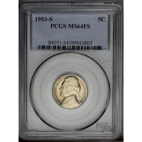 <B>1953-S<5C> MS64 Full Steps PCGS.</B></I> One of the key strike rarities in the entire series of Jefferson nickels. This highly lustrous examples displays glimpses of golden toning at the borders and does exhibit the normal die erosion over much of Monticello. However, five steps are clearly defined under only light magnification. Population: 14 in 64, 2 finer (3/06). <BR><BR><B>Important notice:</B> Heritage usually auctions material at the rate of 200-250 lots per hour. On some occasions eBay Live bid software or the Internet may not be able to keep up with the pace of the auction. We recommend placing a realistic absentee bid now as insurance to avoid disappointment. Occasionally the auctioneer may eliminate or reject an eBay Live bid, and the auctioneer may also reopen a lot after the close of the eBay live bidding (usually because we missed an audience bid), and may reject your bid even if it shows you as the winning bidder. By bidding via eBay Live, you agree that Heritage may award the lot to another bidder at its sole discretion under the circumstances described above or any other reasonable circumstances. Since eBay bids are not shown to us until we open the lot on the floor, we treat those bids just like floor bids. In most cases the floor responds before the eBay bid is presented to us, due to Internet lag time, so for consistency we have made it a policy that floor bids are always considered first over tie eBay live bids. Also please note that all Heritage lots purchased through eBay Live carry a 20% Buyer's Premium. Please make sure you read the Terms and Conditions before you bid. This lot is being auctioned in conjunction with a live floor auction by Heritage Galleries & Auctioneers. All final auction and invoice information will be supplied by Heritage Galleries & Auctioneers, and all other information should be considered preliminary. Lot:1170 <BR><BR><B>Winning Notification and Billing:</B> After the FINAL session in this auction is complete, Heritage will send e-mail and snail mail invoices. This process normally takes several days. All final auction and invoice information will be supplied by Heritage Galleries & Auctioneers, and all other information should be considered preliminary. <BR><BR>This auction will be conducted on a live auction floor and over the Internet through eBay Live. If you choose to place an absentee bid, please take a moment to <font color='#0000ff'><u><a href='http://pages.ebay.com/liveauctions/help/before/laabsentee.html'>learn how eBay Live absentee bidding works</a></u></font><font color='#000000'>