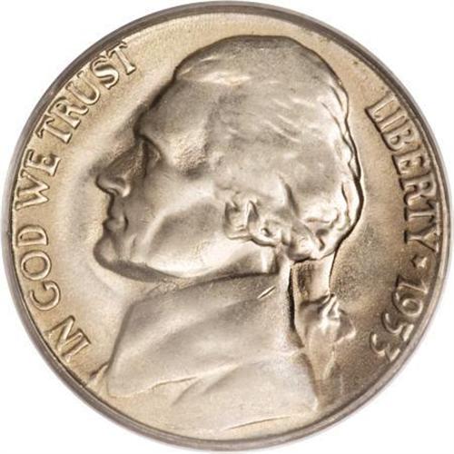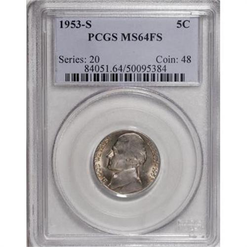 <B>1953-S 5C MS64 Full Steps PCGS.</B></I> While the 1953-S is a comparatively available issue across most designations, Full Steps pieces are exceedingly elusive. This luminous near-Gem, silver-gray with occasional hints of golden-tan near the rims, has typical quicksilver luster and soft overall detail, yet the steps are needle-sharp. Population: 14 in 64 Full Steps, 2 finer (3/08).<BR><BR><b>Shipping:</b> Coins & Currency (<a target="_blank" href="http://www.heritageauctions.com/common/shipping.php">view shipping information</a>)