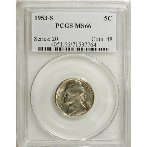 <B>1953-S 5C MS66 PCGS.</B></I> PCGS Population (34/1). NGC Census: (182/24). Mintage: 19,210,900. Numismedia Wsl. Price for NGC/PCGS coin in MS66: $28. (#4051)<BR><BR><b>Shipping:</b> Coins & Currency (<a target="_blank" href="http://www.heritageauctions.com/common/shipping.php">view shipping information</a>)