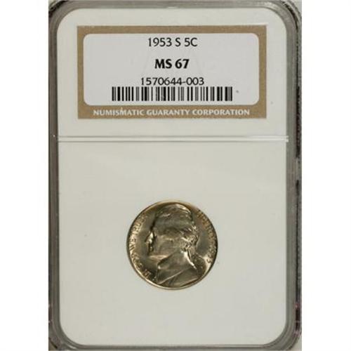 <B>1953-S 5C MS67 NGC.</B></I> NGC Census: (13/0). PCGS Population (1/0). Mintage: 19,210,900. (#4051)<BR><BR><B>Coin Engraver:</B> Felix Schlag<BR><BR><b>Shipping:</b> Coins & Currency (<a target="_blank" href="http://www.heritageauctions.com/common/shipping.php">view shipping information</a>)