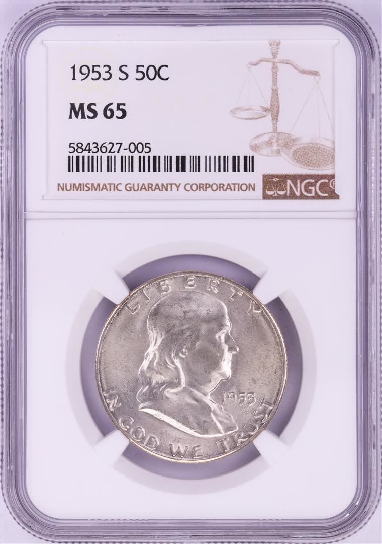 One 1953-S Franklin Half Dollar Coin NGC MS65. NGC Certified.