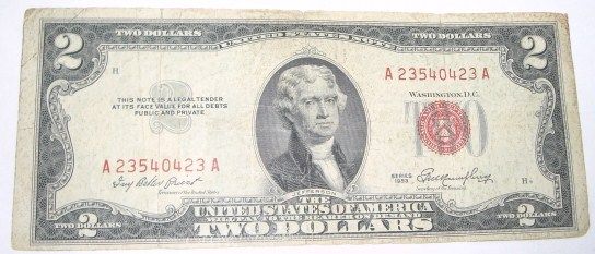 1953 SERIES $2 RED SEAL BILL SERIAL # A23540423A *NICE BILL - LOOK TO DETERMINE GRADE*!! ***Coin, Currency & All Items Listed in this auction - Grades, Conditions and Values are not Safe Deposit Coins LLC Responsibilty. Grades, Condition and Values are determined by Consigner(s) & Buyers ONLY