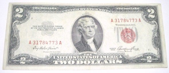 1953 SERIES $2 RED SEAL CERTIFICATE SERIAL # A31784773A *EXTREMELY RARE AU HIGH GRADE*! ***Coin, Currency & All Items Listed in this auction - Grades, Conditions and Values are not Safe Deposit Coins LLC Responsibilty. Grades, Condition and Values are determined by Consigner(s) & Buyers ONLY