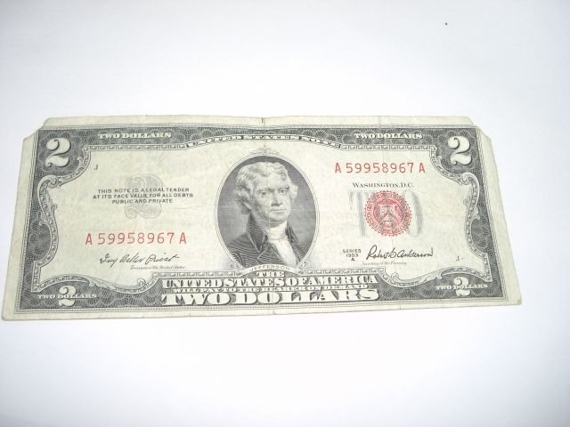 1953 SERIES A $2 RED SEAL NOTE *SERIAL #A59958967A*!! ***Coin, Currency & All Items Listed in this auction - Grades, Conditions and Values are not Safe Deposit Coins LLC Responsibilty. Grades, Condition and Values are determined by Consigner(s) & Buyers ONLY***
