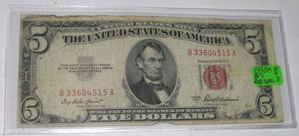 1953 SERIES A $5.00 RED SEAL BILL SERIAL # B33604515A *NICE EARLY NOTE*!! DOLLAR BILL CAME OUT OF SAFE!! ***Coin, Currency & All Items Listed in this auction - Grades, Conditions and Values are not Safe Deposit Coins LLC Responsibilty. Grades, Condition and Values are determined by Consigner(s) & Buyers ONLY***