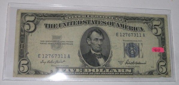 1953 SERIES A $5 SILVER CERTIFICATE SERIAL # E12767311A *RARE VERY FINE GRADE EARLY NOTE*!! BILL CAME OUT OF SAFE BOX!! ***Coin, Currency & All Items Listed in this auction - Grades, Conditions and Values are not Safe Deposit Coins LLC Responsibilty. Grades, Condition and Values are determined by Consigner(s) & Buyers ONLY