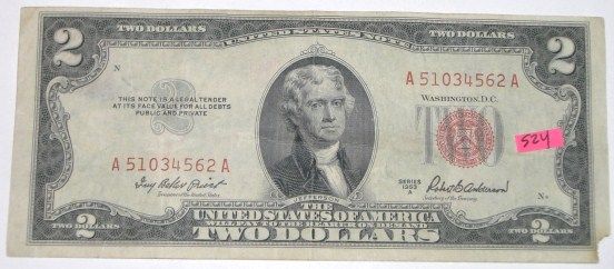 1953 SERIES A RED SEAL $2 BILL SERIAL # A51034562A *RARE EARLY BILL*!! BILL CAME OUT OF SAFE!! ***Coin, Currency & All Items Listed in this auction - Grades, Conditions and Values are not Safe Deposit Coins LLC Responsibilty. Grades, Condition and Values are determined by Consigner(s) & Buyers ONLY***