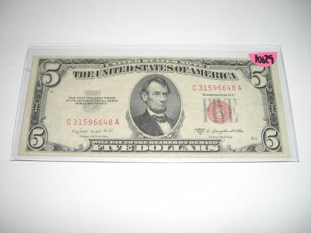 1953 SERIES B RARE *RED SEAL-BOND* $5.00 SERIAL # C31596648A. CURRENCY BILL CAME OUT OF SAFE!! ***Coin, Currency & All Items Listed in this auction - Grades, Conditions and Values are not Safe Deposit Coins LLC Responsibilty. Grades, Condition and Values are determined by Consigner(s)