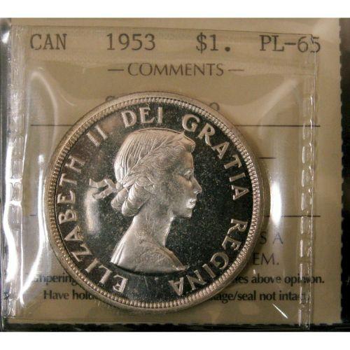 1953 SF $1 ICCS PL-65 CAMEO A premium quality example. An extraordinary Elizabeth II example in Superb Gem condition. The coin is fully struck and has full lustre. It has reflective surfaces on both the obverse and reverse and superb eye appeal.