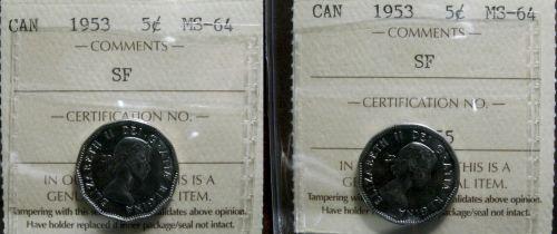 1953 SF 5¢ ICCS MS64. Lot of two pieces.