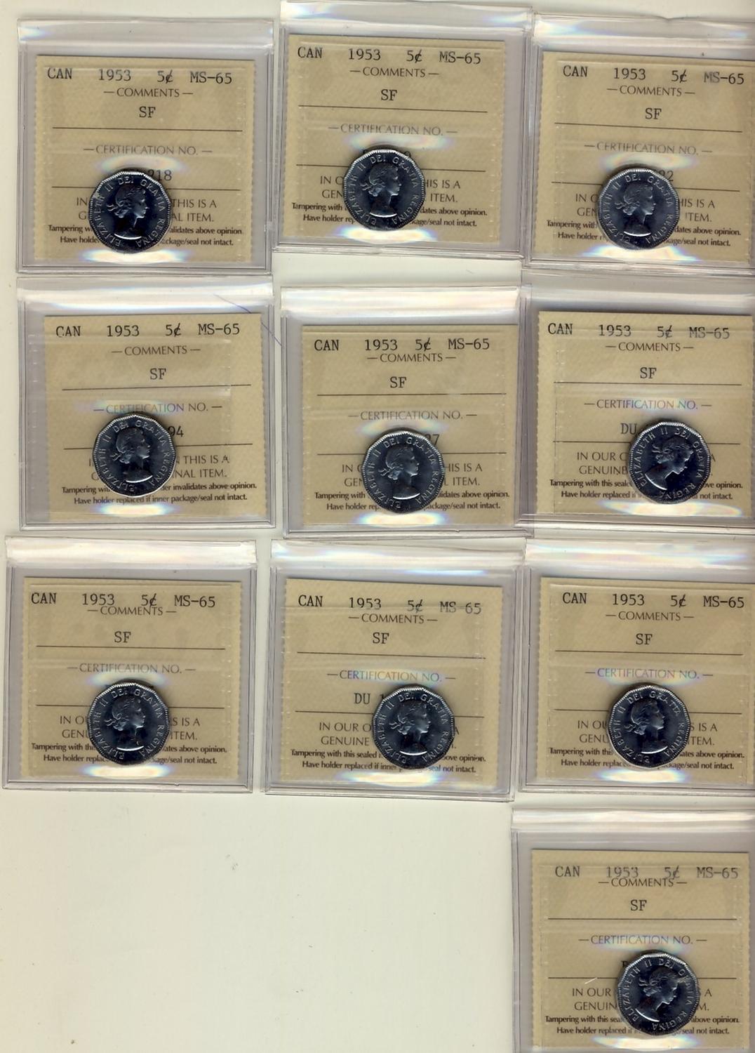 1953 SF 5¢ ICCS MS65. Lot of 10 coins.