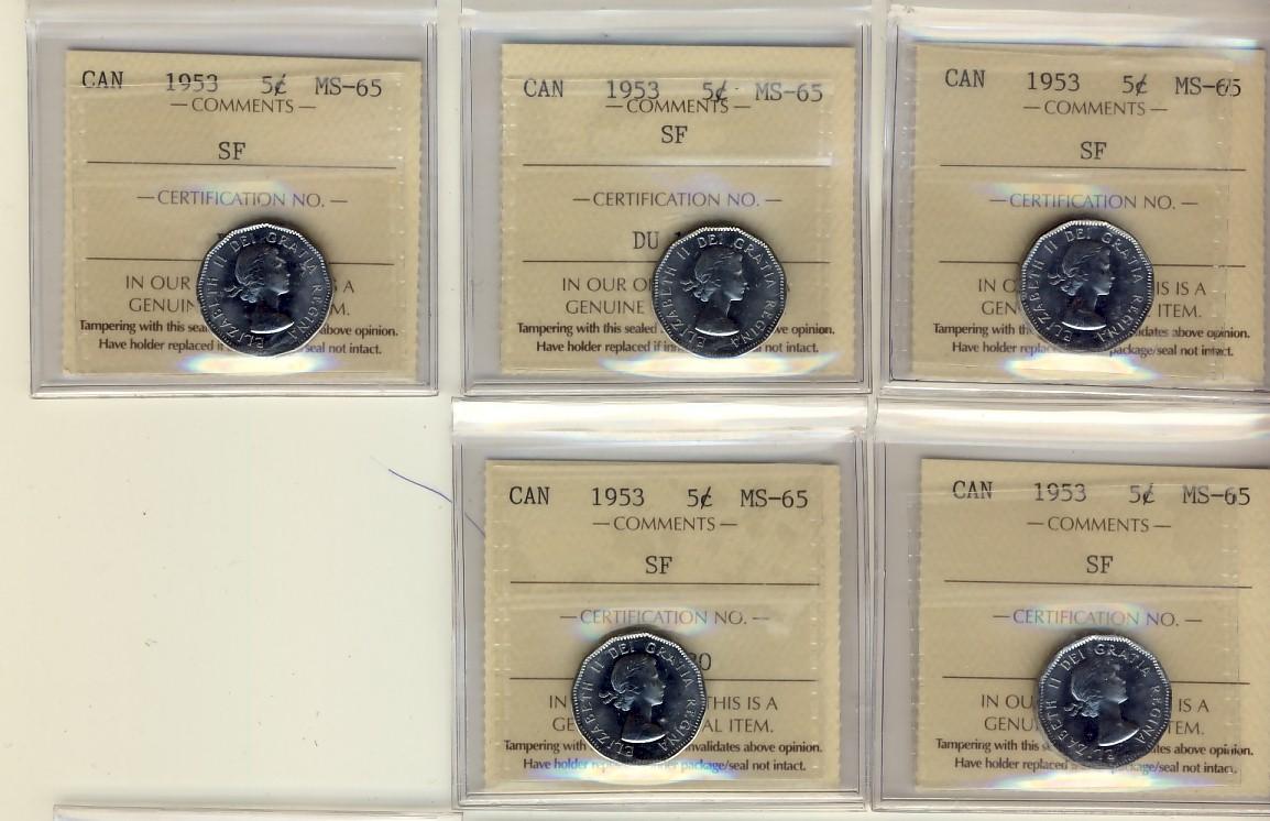 1953 SF 5¢ ICCS MS65. Lot of 5 coins.