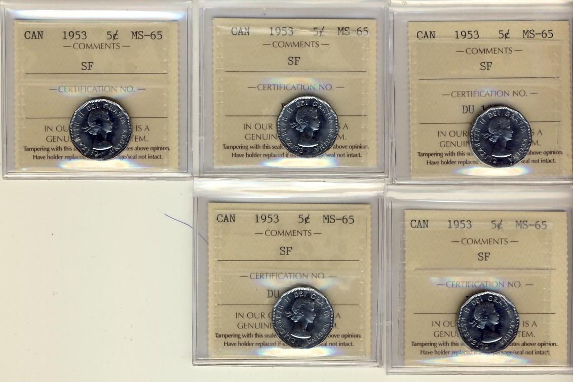 1953 SF 5¢ ICCS MS65. Lot of 5 coins.