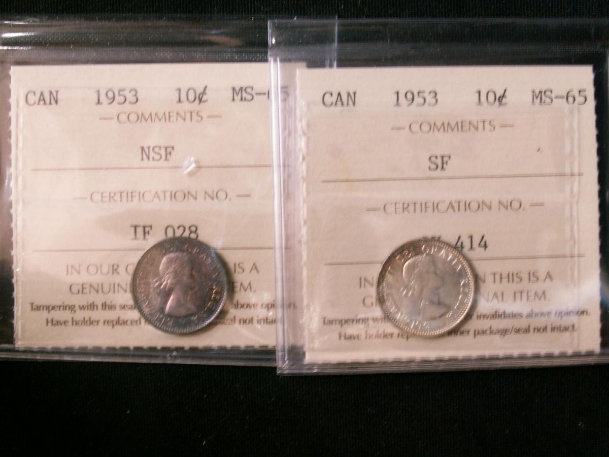 1953 SF & NSF 10¢ ICCS MS65. Lot of 2 coins.