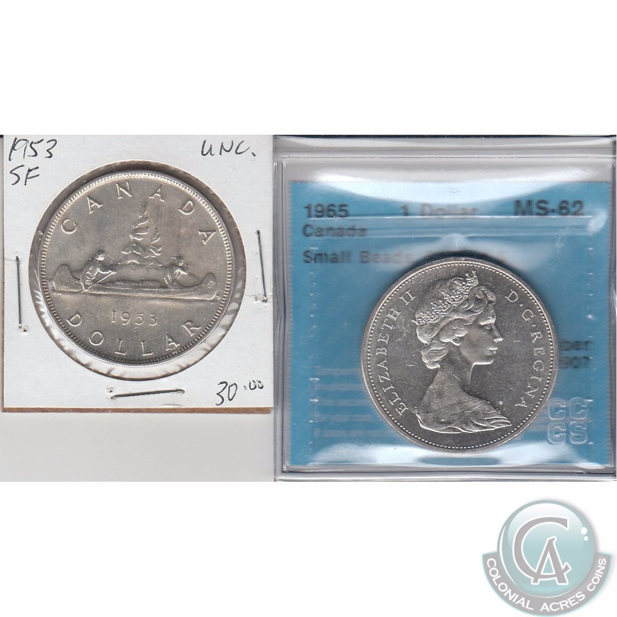 1953 SF Silver Dollar in UNC & 1965 SmBds PTD 5 Dollar CCCS Certified MS-62 (2pcs)