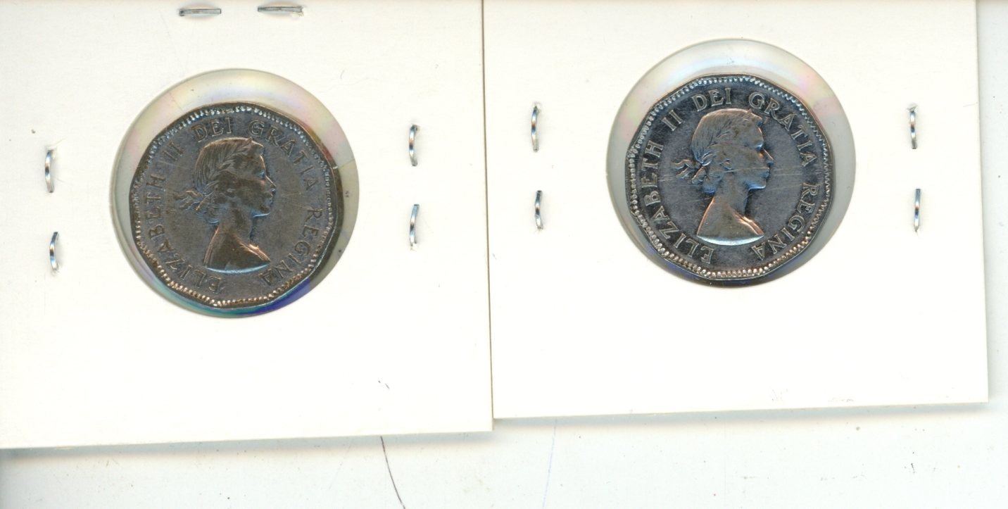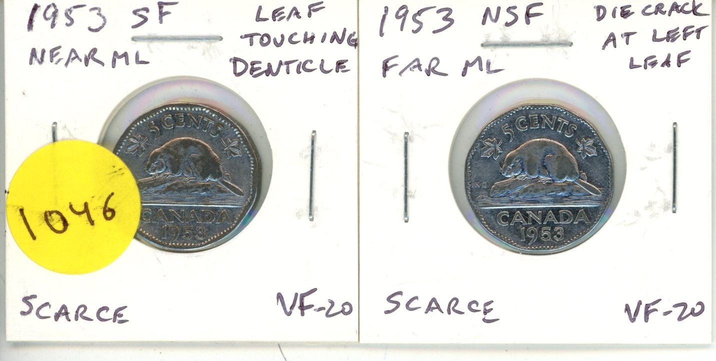 1953 Shoulder Fold Canadian 5 Cents. Near Maple Leaf with Leaf Touching Rim. VF-20. Scarce. and 1953 No Shoulder Fold Canadian 5 Cents. Far Maple Leaf with Die Crack at Left Leaf. VF-20. Scarce.