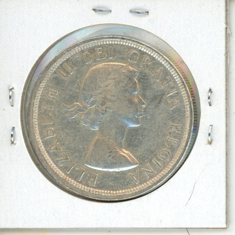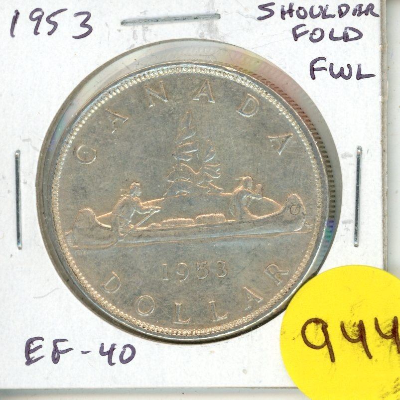 1953 Shoulder Fold Canadian Silver Dollar with Full Water Lines in front of Canoe. EF-40.