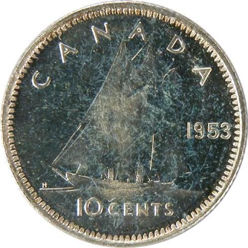 Canada Ten Cents 1953 Shoulder Fold ICCS PL-66 Cameo. A superbly lustrous piece with pale golden rim toning