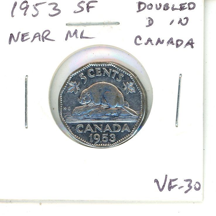 1953 Shoulder Fold Near Maple leaf nickel 5 Cents with Doubled D in Canada . VF-30. Scarce