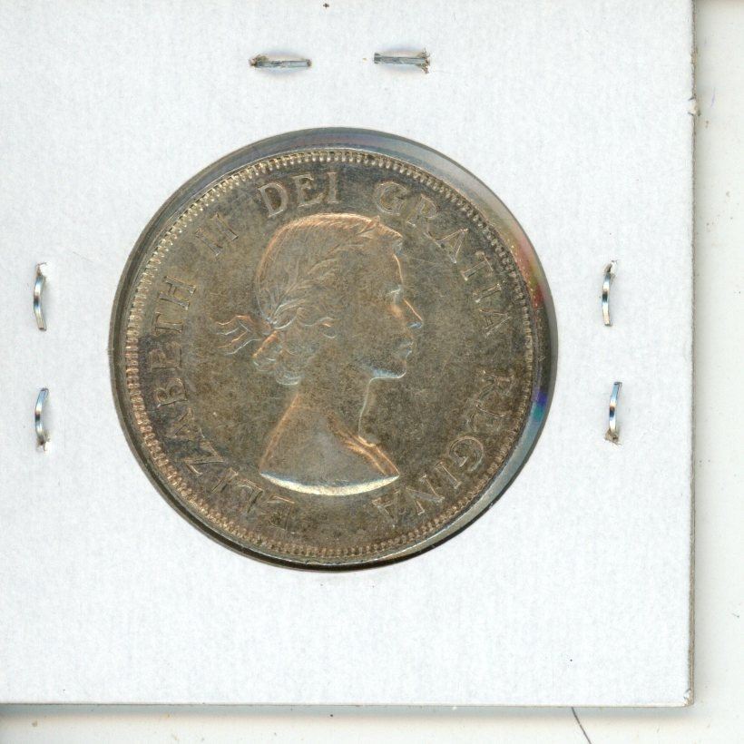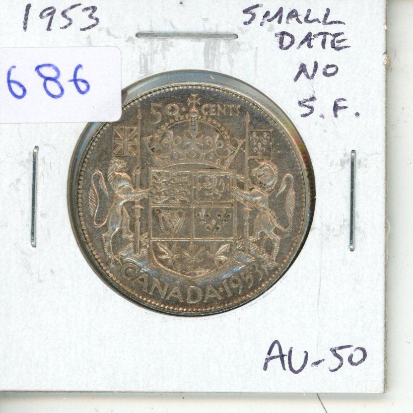 1953 Small Date, No Shoulder Fold Canadian Silver 50 Cents. First issue of the new queen. AU-50. Nice.