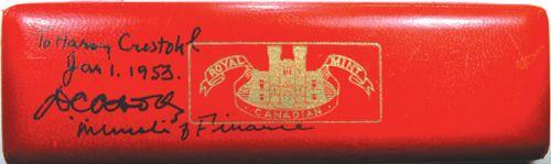 Canada 1953 Specimen Set Case CH-12. Inscribed "To Harvey Cristohl Jan 1, 1953" and signed "DC Abbott Minister of Finance" on the top of the case. Harvey was the son of Leon David Crestohl, Member of Parliament from 1950 to 1962. The coins are Dollar, 50 Cents and 5 Cents in ICCS SP-64, 25 Cents and 10 Cents in ICCS MS-60 and 1 Cent in ICCS AU-55, all No Shoulder Fold