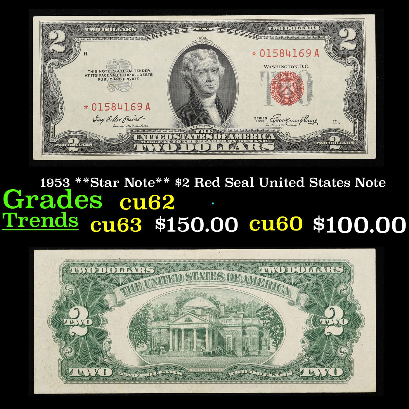 1953 **Star Note** $2 Red Seal United States Note Grades Select CU. When notes are discovered that have been printed incorrectly (such as having the serial numbers upside down, etc.) the misprinted "error notes" are replaced with star notes because no two bills within a certain series can be produced with the same serial number. They are used to maintain a correct count of notes in a serial number run. By their nature, star notes are more scarce than notes with standard serial numbers and as such are widely collected by numismatists. Some of the highest prices paid for modern (post-1928) U.S. banknotes have been for star notes. The note itself is a Silver Certificate. Silver Certificates were redeemable in Silver. One of their most distinctive qualities is the blue Treasury seal and serial numbers. These notes include an additional legend printed on the face that is not present on any other Federal Reserve notes. The legend states that Silver had been deposited in the Treasury and was payable on demand to the note’s bearer.