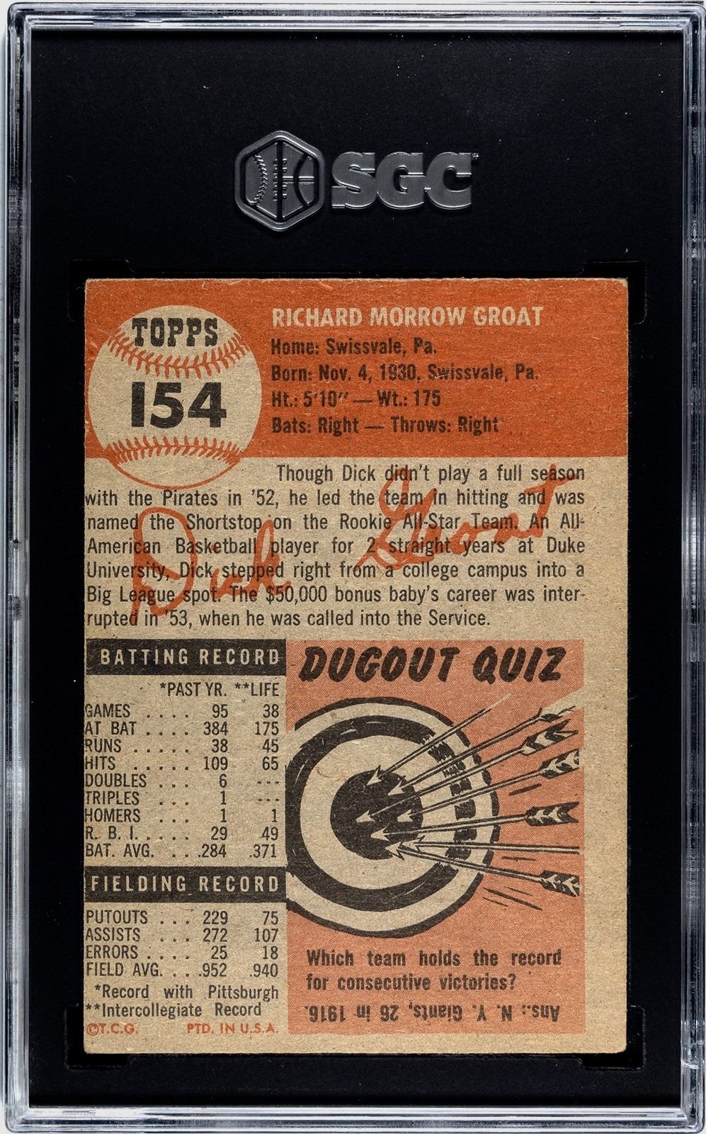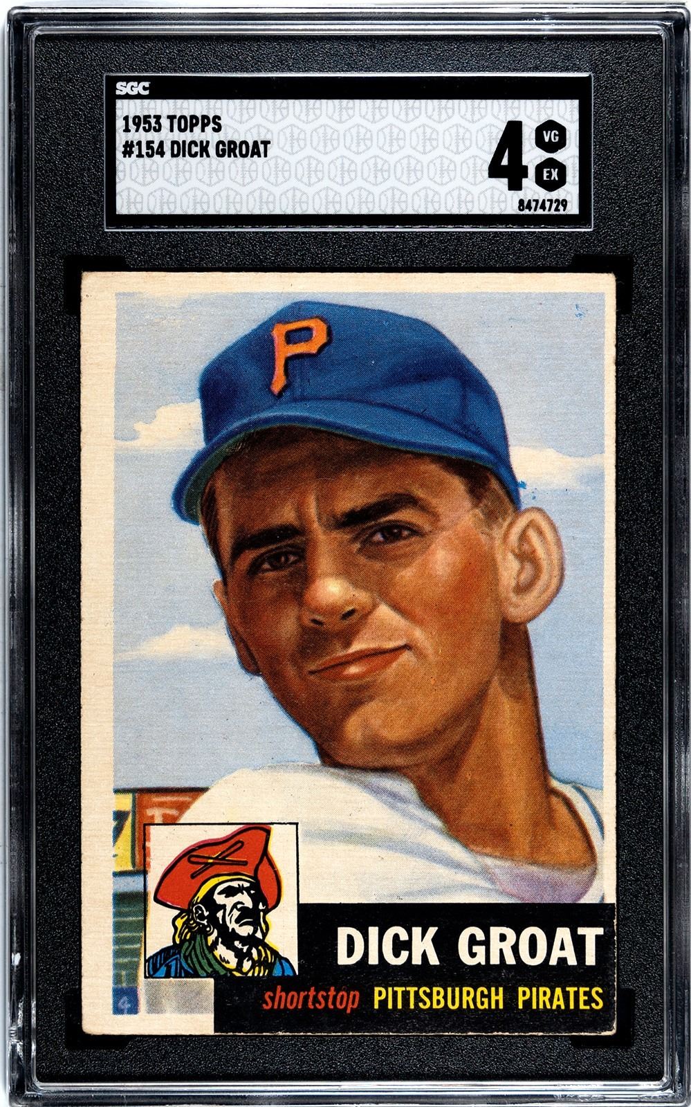 Solid mid-grade 2nd year card of Dick Groat. Groat was a star shortstop that made 8 All-Star teams, won two World Series, and a batting title. He was a two sport star at Duke (baseball and basketball), and even played briefly in the NBA after his rookie baseball season in 1952. This card, from a classic set, grades 4 VG-EX by SGC.