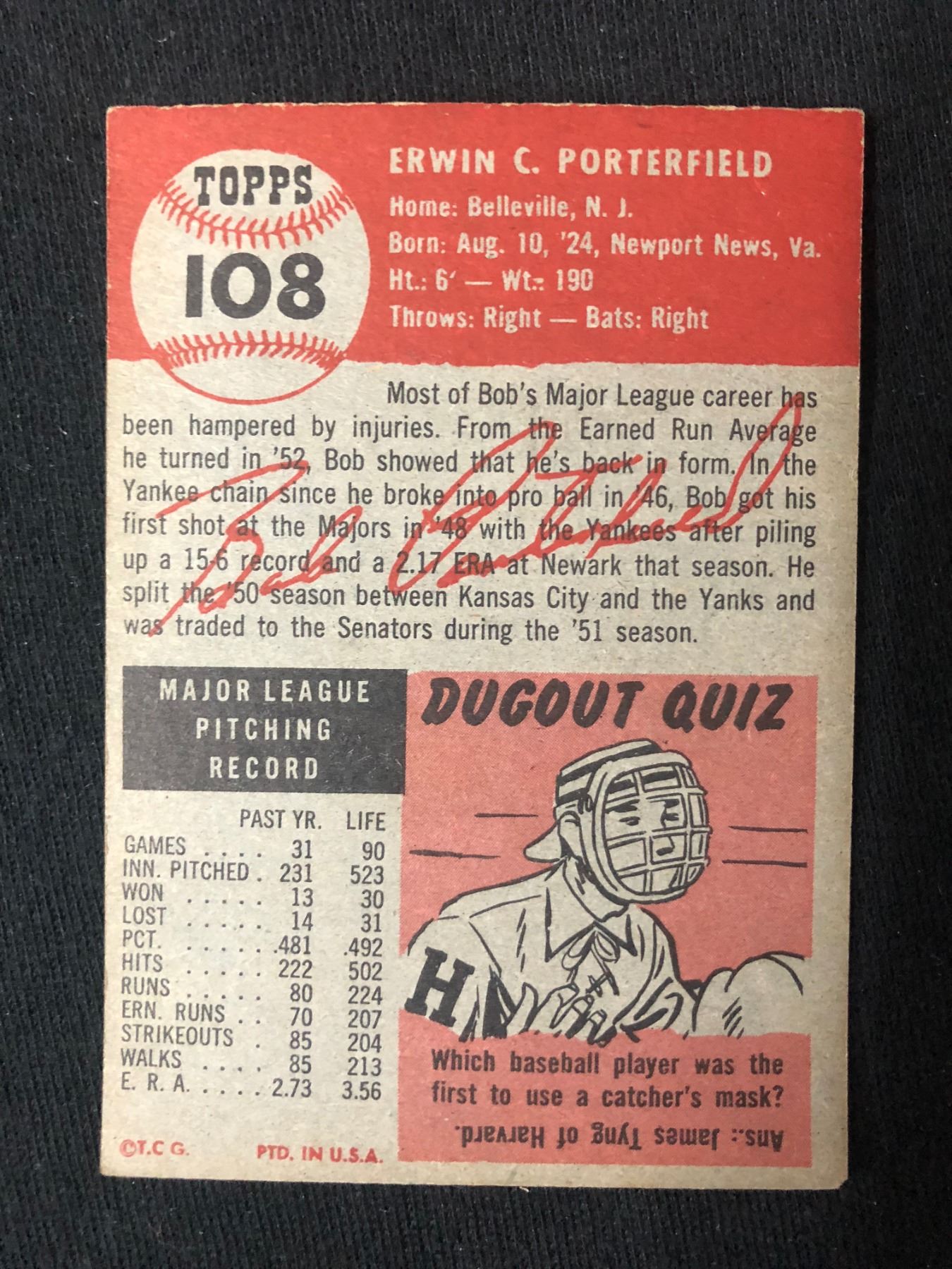 1953 Topps Baseball Card #108 Bob Porterfield