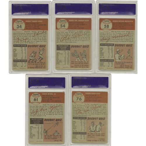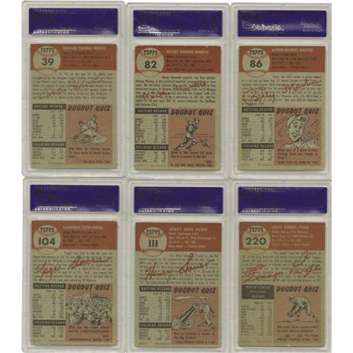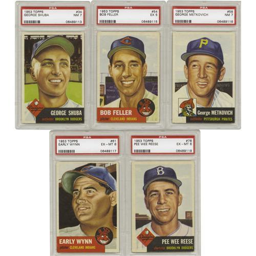 <B>1953 Topps Baseball Complete Set (274).</B></I> The beautifully designed Topps set, originally intended to consist of 280 cards, is missing six numbers (253, 261, 267, 268, 271 and 275) most likely due to its continuing legal battles with Bowman. A total of 11 cards have been graded by PSA with an aggregate SMR value of $2240. Graded cards - <B>PSA 8:</B></I> #39, 111 Sauer; <B>PSA 7:</B></I> #34, 58, 86 Martin; <B>PSA 6:</B></I> #61 Wynn, 76 Reese, 104 Berra, 220 Paige; <B>PSA 5:</B></I> #54 Feller; <B>PSA 4:</B></I> #82 Mantle. Ungraded cards include #1 Robinson (VG), 27 Campanella (VG), 37 Mathews (color added), 41 Slaughter (G), 62 Irvin (EX), 77 Mize (EX), 78 Schoendienst (EX), 114 Rizzuto (G), 138 Kell (EX), 141 Reynolds (G/VG), 147 Spahn (G/VG), 151 Wilhelm (VG/EX), 162 Kluszewski (VG), 191 Kiner (VG/EX), 207 Ford (VG/EX), 228 Newhouser (VG/EX), 244 Mays (G), 258 Gilliam (VG/EX), 263 Podres (VG/EX), 280 Bolling (EX). Grades 43% EX to EX/MT (some better), 50% VG to VG/EX, 7% GD.