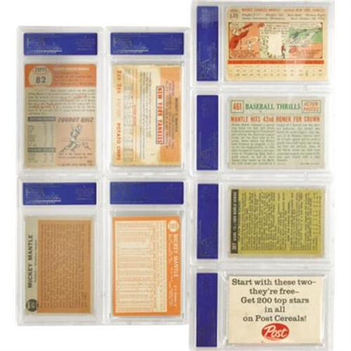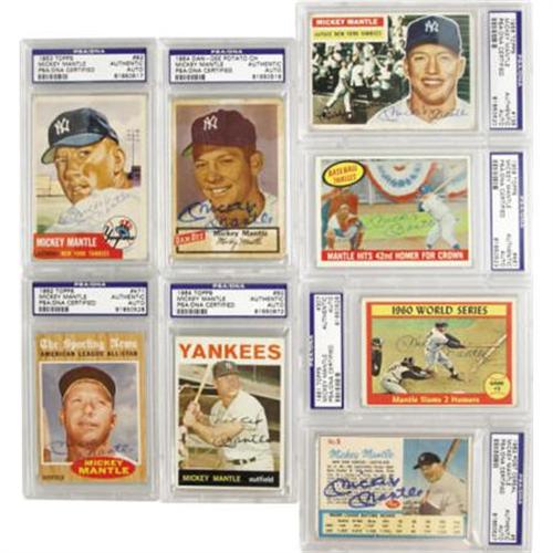 <B>1950's-60's Mickey Mantle Signed Trading Cards Lot of 8.</B></I> Vintage cardboard dates to the active duty of this Bronx baseball hero, with each signed in later years in 9/10 and better ink and marker unless otherwise noted. Cards themselves average VG in condition, and break down as follows: 1953 Topps #82, 1954 Dan-Dee Potato Chips, 1956 Topps #135, 1959 Topps #461, 1961 Topps #307, 1962 Topps #471, 1962 Post Cereal #5, 1964 Topps #50 (autograph 6/10). Each is encapsulated as "Authentic" by PSA/DNA for protection and unquestioned authenticity. A fantastic dealer's lot.<BR><BR><b>Shipping:</b> Sportscard (<a target="_blank" href="http://www.heritageauctions.com/common/shipping.php">view shipping information</a>)