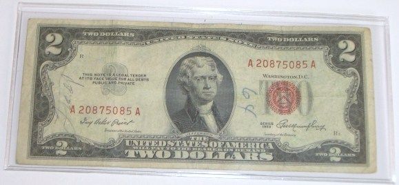 1953 U.S. $2 bill *Red Stamp* ***Coin, Currency & All Items Listed in this auction - Grades, Conditions and Values are not Safe Deposit Coins LLC Responsibilty. Grades, Condition and Values are determined by Consigner(s) & Buyers ONLY***